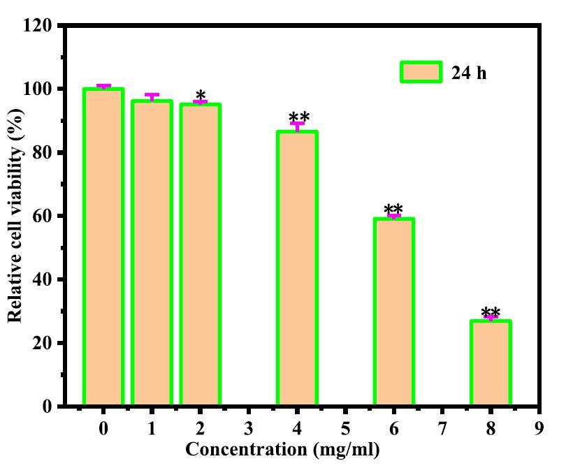 Fig. 15. Cell viability of HeLa cells treated with different concentrations of CeF3:Tm3+,Er3+-PEG nanoparticles at 24 h (0 mg/ml is Control group, *P < 0.05, **P < 0.01).