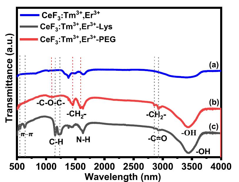 Fig. 12. The infrared spectra of CeF3:Tm3+, Er3+, CeF3:Tm3+, Er3+-Lys and CeF3:Tm3+, Er3+-PEG nanoparticles.