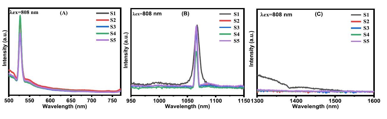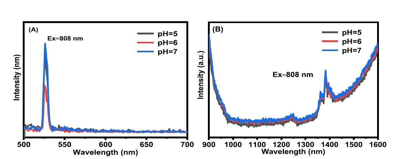 Fig. 14. Up- and down-conversion emission spectra of CeF3:Tm3+, Er3+-PEG nanoparticles in aqueous solutions (pH = 5, 6, 7).
