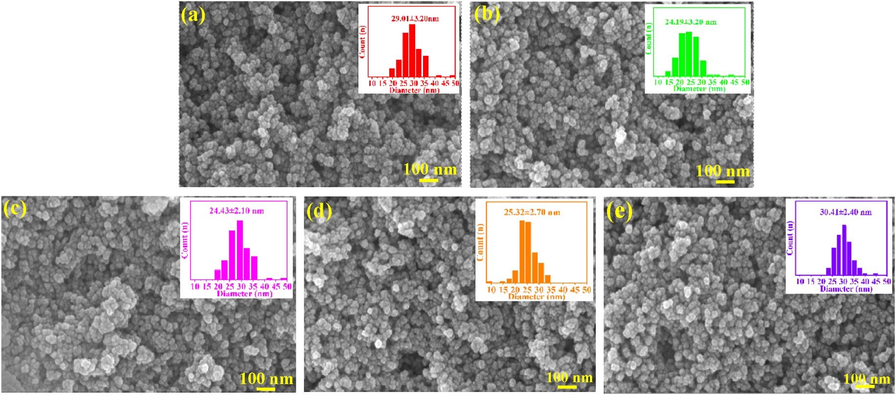 Fig. 4. SEM images of CeF3:Tm3+, Er3+ nanoparticles obtained by direct precipitation method (a-S1) (b-S2) (c-S3) (d-S4) (e-S5).