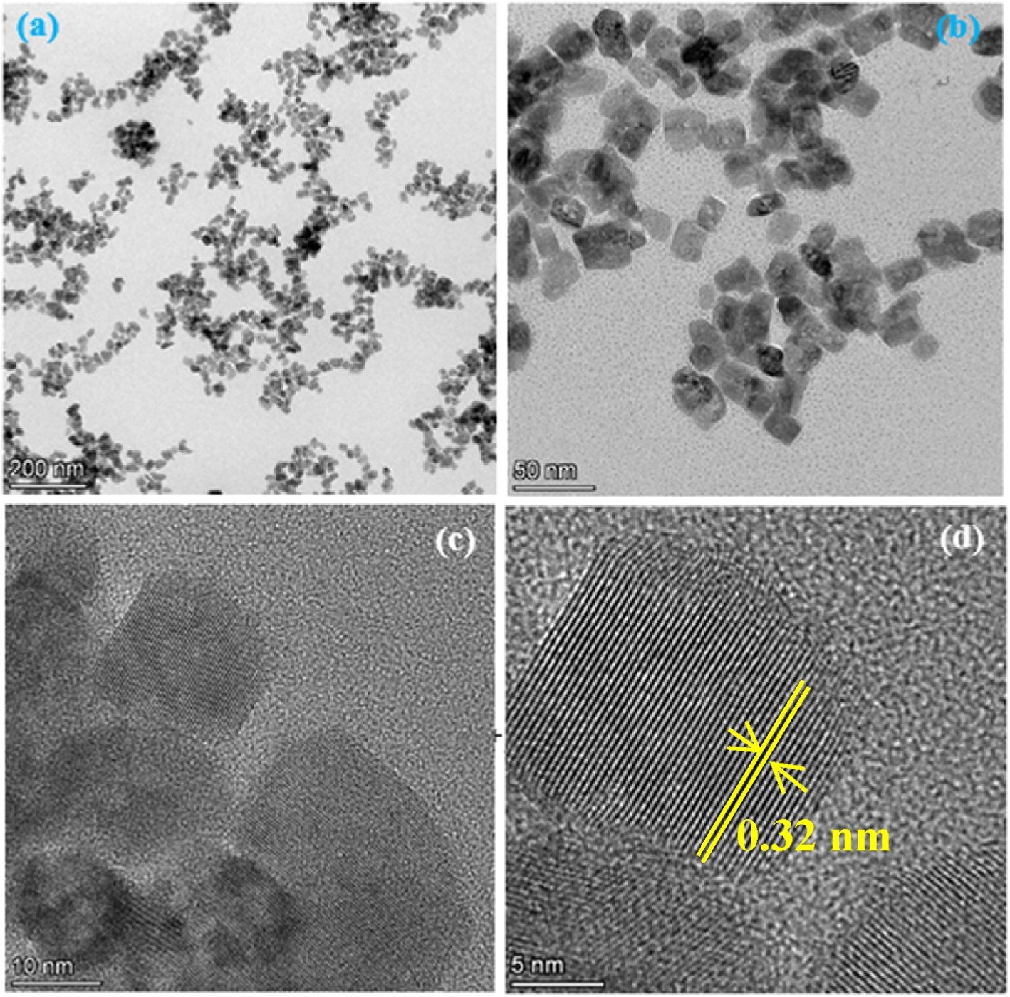 Fig. 7. (a~d) TEM images of CeF3:Tm3+, Er3+ nanoparticles (hydrothermal method, 10 h).