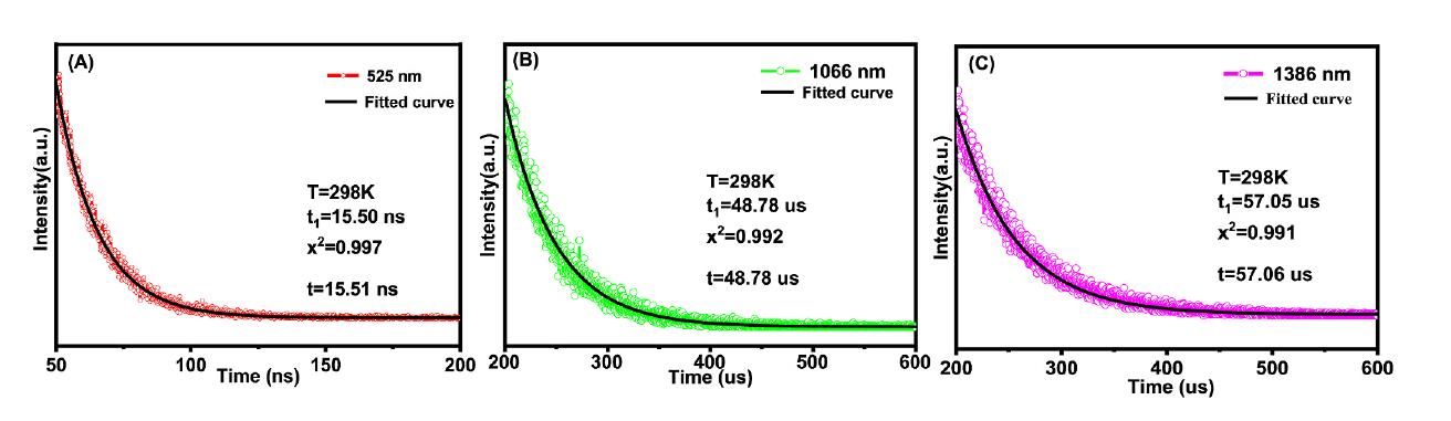 Fig. 11. Fluorescent decay curves of 5D0-7F2 (525 nm), 4I15/2 → 4I11/2 (1066 nm) and 4I15/2 → 4I13/2 (1386 nm) for Er3+.