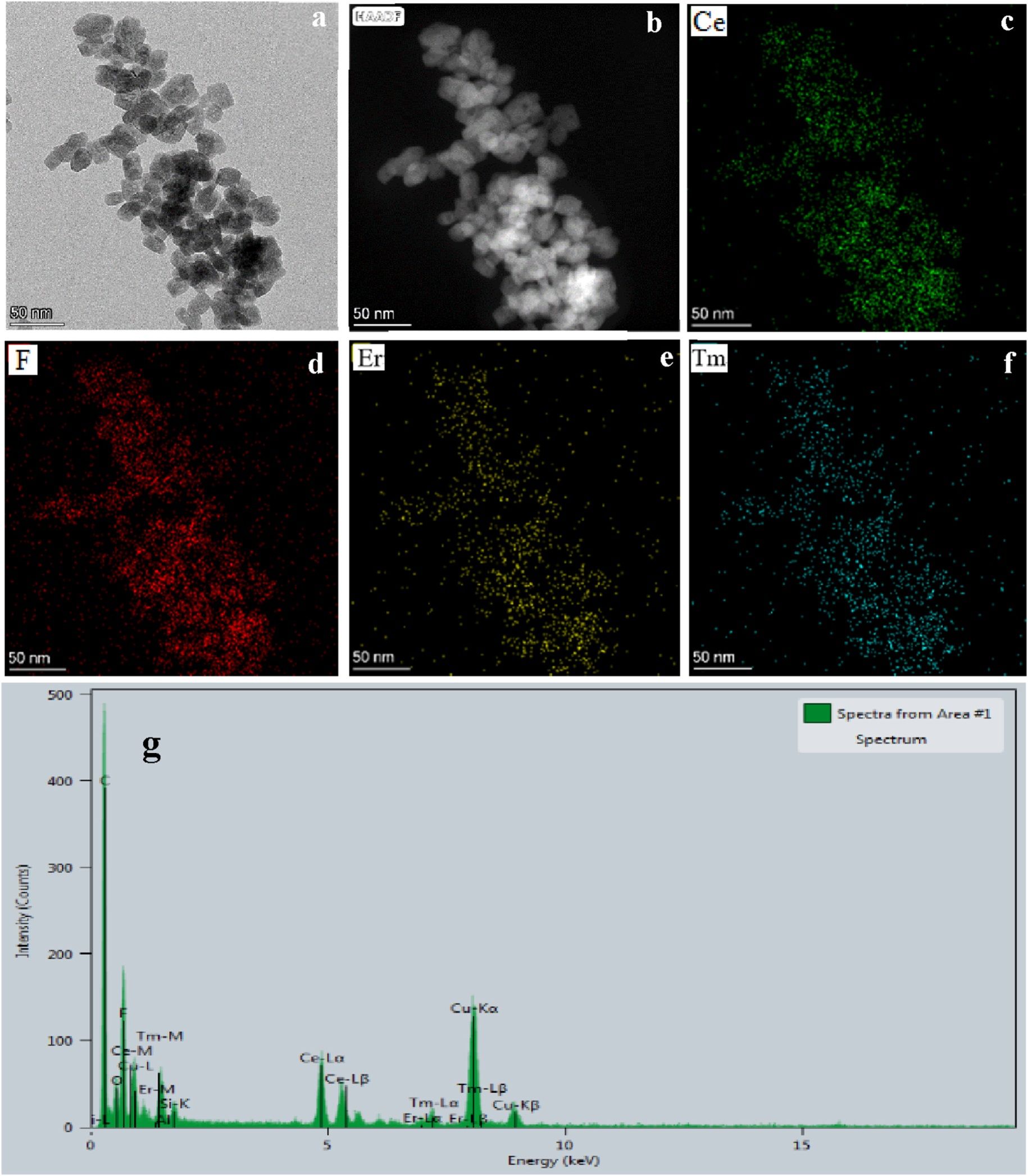 Fig. 8. (a,b) TEM and (c ~ g) Energy Dispersive X-ray (EDX) mapping of CeF3:Tm3+, Er3+ nanoparticles.