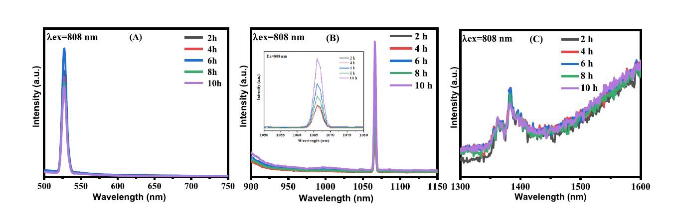 Compared with the reported research work [[30], [31], [32], [33], [34], [35]], the highlights of this research work are as follows: (1) Novel CeF3:Tm3+, Er3+ up-down conversion luminescent nanoparticles with small size and high stability were synthesized by direct precipitation and hydrothermal methods. Novel CeF3:Tm3+, Er3+ up-down conversion luminescent nanoparticles successfully combined advantage of the narrow emission peak of visible fluorescence with the deep tissue penetration advantage of NIR-II. (2) The influence of the preparation method and experiment condition of novel CeF3:Tm3+, Er3+up-down conversion luminescent nanoparticles on the luminescence performance was systematically studied, and the optimal preparation conditions were determined. (3) The influence and mechanism of surface modification on the dispersion stability and luminescence properties in different aqueous solutions (pH = 5–7) of novel CeF3:Tm3+, Er3+ up-down conversion luminescent nanoparticles were studied. (4) It reveals the influence mechanism of the surface modification and temperature change of novel CeF3:Tm3+, Er3+ up-down conversion luminescent nanoparticles on up-down conversion luminescent property.