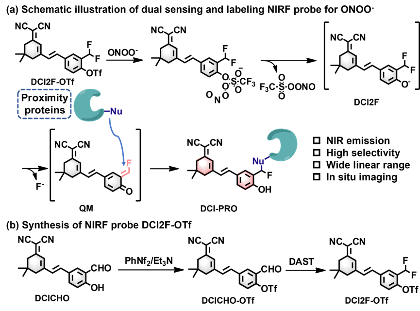 Scheme 1. (a) Schematic illustration of dual sensing and labeling NIRF probe DCI2F-OTf for ONOO-. (b) Synthesis of NIRF probe DCI2F-OTf.