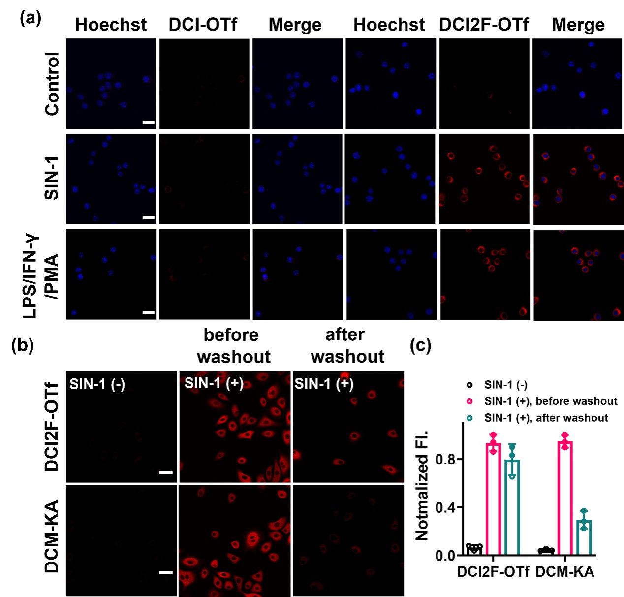 Figure 2. (a) RAW264.7 cells were pretreated with SIN-1 (200 μM, 30 min) or stimulated with LPS (1.0 μg/mL), IFN-γ (100 ng/mL) for 12 h, PMA (10 nM) for 30 min, and then incubated with DCI-OTf (10 μM, 30 min) or DCI2F-OTf (10 μM, 30 min), respectively. The red channel was collected in the range of 600-700 nm (λex = 488 nm) and the Hoechst channel was collected in the range of 430-480 nm (λex = 405 nm). (b) A549 cells were pretreated with SIN-1 (200 μM, 30 min), followed by incubation with DCI2F-OTf (10 μM, 30 min) or DCM-KA (10 μM, 30 min), before or after washout with fresh DMEM (three times, each for 6 min). (c) Normalized fluorescence intensity plots of DCI2F-OTf and DCM-KA labeled cells in (b) (n = 3). Scale bar: 50 μm.