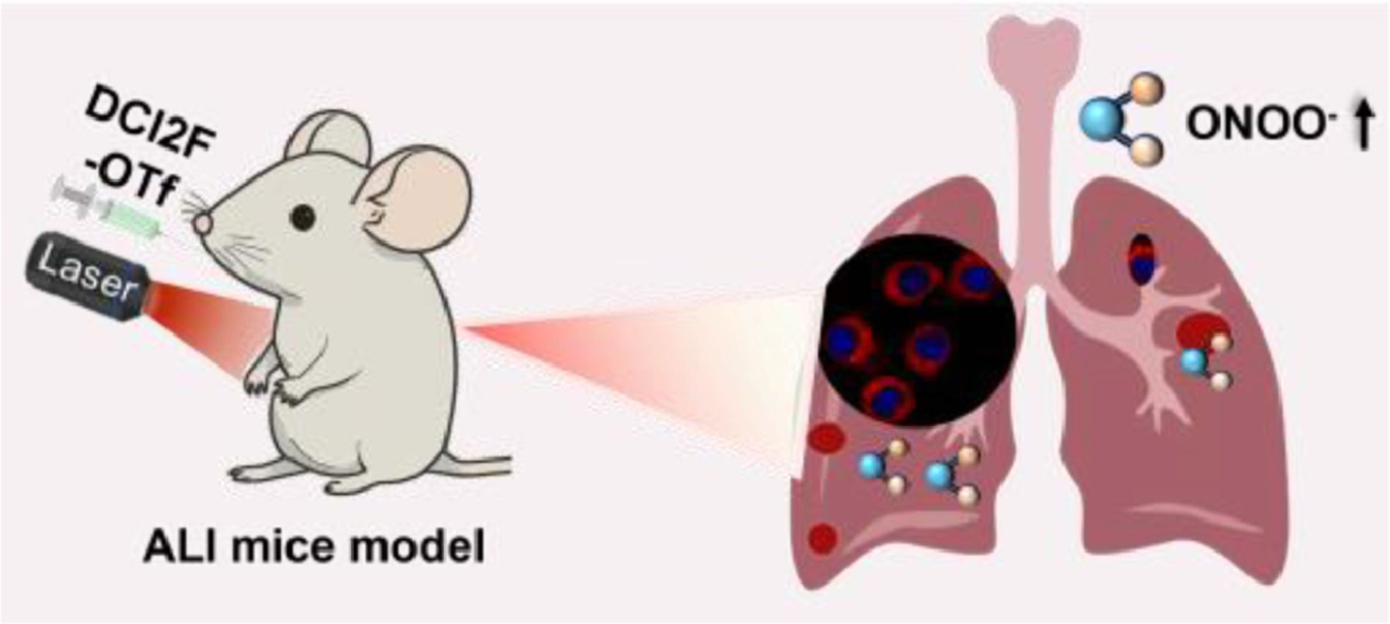 Acute lung injury (ALI) is a serious clinical condition with a high mortality rate. Oxidative stress and inflammatory responses play pivotal roles in the pathogenesis of ALI. ONOO− is a key mediator that exacerbates oxidative damage and microvascular permeability in ALI. Accurate detection of ONOO− would facilitate early diagnosis and intervention in ALI. Near-infrared fluorescence (NIRF) probes offer new solutions due to their sensitivity, depth of tissue penetration, and imaging capabilities. However, the developed ONOO− fluorescent probes face problems such as interference from other reactive oxygen species and easy intracellular diffusion. To address these issues, we introduced an innovative self-immobilizing NIRF probe, DCI2F-OTf, which was capable of monitoring ONOO− in vitro and in vivo. Importantly, leveraging the high reactivity of the methylene quinone (QM) intermediate, DCI2F-OTf was able to covalently label proteins in the presence of ONOO−, enabling in situ imaging. In mice models of ALI, DCI2F-OTf enabled real-time imaging of ONOO− levels and found that ONOO− was tightly correlated with the progression of ALI. Our findings demonstrated that DCI2F-OTf was a promising chemical tool for the detection of ONOO−, which could help to gain insight into the pathogenesis of ALI and monitor treatment efficacy.