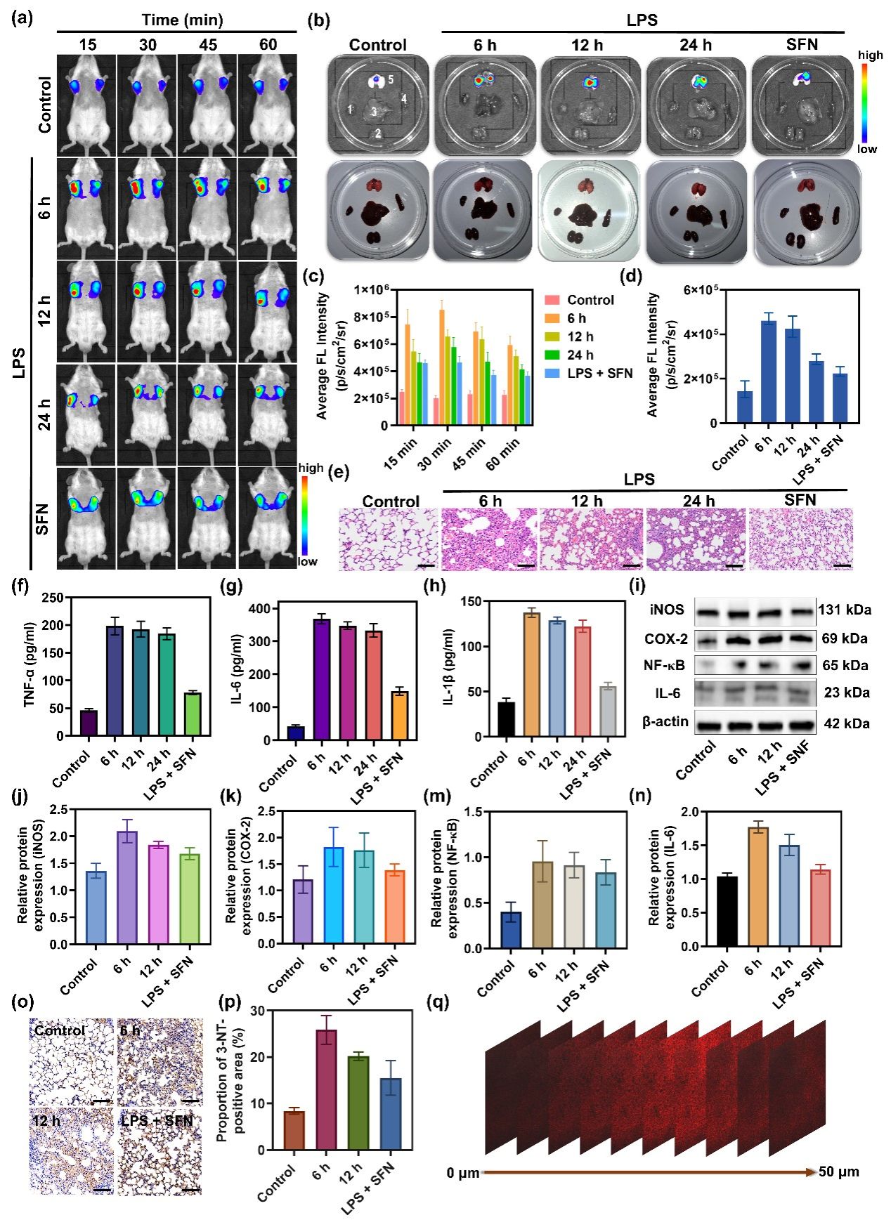 Figure 5. (a) NIRF images of control and LPS-stimulated mice after intravenous administration of DCI2F-OTf (200 μM, 45 μL). (b) NIRF imaging and photographs of dissected major organs (1: heart, 2: kidney, 3: liver, 4: spleen, 5: lung) from mice in panel (a). (c) The histogram presents the average radiant efficiency of mice in panel (a). (d) The histogram presents the average radiant efficiency of the lung in panel (b). (e) H&E staining histological images for lung tissue in control and LPS-stimulated mice. Scale bar: 50 μm. (f-h) Serum levels of inflammatory factors TNF-α, IL-6, and IL-1β in control and LPS-stimulated mice. (i) The protein levels of iNOS, COX-2, NF-κB, and IL-6 were detected by western blot analysis. (j-n) The relative protein expression level of iNOS, COX-2, NF-κB, and IL-6 in (i). (o-p) Sections of lung tissue were immunostained with an antibody that detected 3-NT. Scale bar: 50 μm. (q) NIRF images of mice fresh lung tissue sections from ALI mice in the LPS6 group. The confocal Z-axis scan images at 0, 5, 10, 15, 20, 25, 30, 35, 40, 45, and 50 µm penetration depths. λex = 488 nm; red channel: λem = 600 - 700 nm.