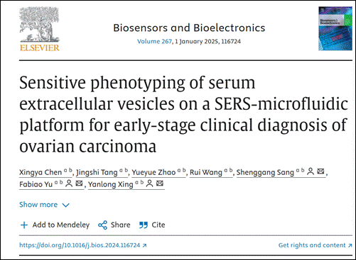近日,本课题组在Elsevier期刊Biosensors and Bioelectronics上发表题为“Sensitive phenotyping of serum extracellular vesicles on a SERS-microfluidic platform for early-stage clinical diagnosis of ovarian carcinoma”的研究成果。该研究通过设计一种表面增强拉曼散射(SERS)-多通道芯片检测sEVs(S-MMEV)的方法来研究sEVs的表面蛋白特征,成功通过对sEVs的表型分析区分健康人群和卵巢癌患者,实现了对早期卵巢癌患者进行精准诊断。为基于sEVs的癌症早期诊断提供了一种具有重要应用价值的新方法。