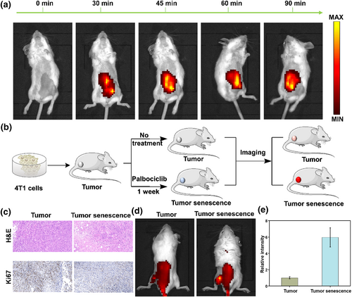 FIGURE 3 Imaging endogenous β-gal in mice. (a) Imaging β-gal in the mouse peritoneal cavity at different time points (0–90 min). (b) Schematic diagram of mouse tumor and senescence tumor modeling. (c) H&E and Ki67 staining for mouse tumors and palbociclib-induced tumor senescence. (d) Imaging of β-gal in mice tumor and senescence tumor modeling. (e) Relative fluorescence intensity in (d). λex = 640 nm, λem = 680–770 nm.