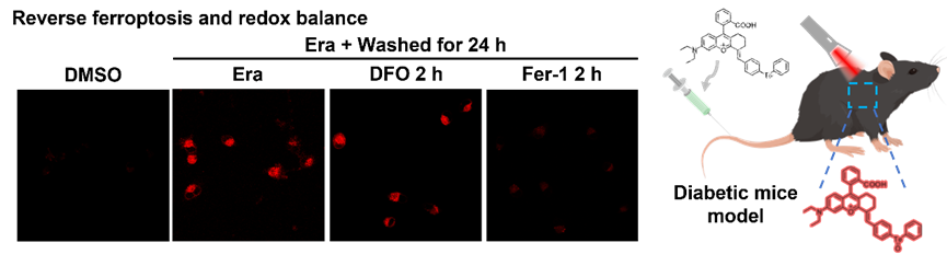 Ferroptosis is a type of cell death triggered by the iron-dependent accumulation of lipid peroxides in cells. Diabetes, a chronic metabolic disorder characterized by hyperglycemia, can lead to various health complications. The process of ferroptosis and the progression of diabetes are closely linked to redox homeostasis, which is regulated by the levels of reactive oxygen and sulfur species. Currently, there are no fluorescent probes available to monitor changes in redox homeostasis during ferroptosis and diabetes. Here, we report the first endeavor to create a reversible near-infrared fluorogenic (NIRF) probe for monitoring the process of ferroptosis reversal and precise diabetes diagnosis. In vitro data demonstrated that NIR-CSTe could cyclically and reversibly detect ONOO– and GSH up to four times with minimal loss in fluorescence intensity. With the help of NIR-CSTe, we observed that HT-1080 cells, induced to undergo ferroptosis by erastin after being washed with PBS for 24 h and then treated with ferrostatin-1, showed a recovery in intracellular GSH levels. In contrast, treatment with deferoxamine did not yield similar results. Lastly, NIR-CSTe was also utilized for the early diagnosis and efficacy assessment of diabetes in relation to ONOO–/GSH redox balance, with results illustrating that the combined administration of metformin and empagliflozin was more effective than using either drug alone. Thus, this smart probe holds significant potential as an essential tool for clinical diagnosis and treatment of diseases associated with redox homeostasis.