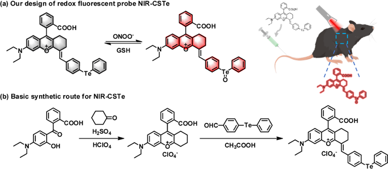 Scheme 1. (a) Our design of redox fluorescent probe NIR-CSTe. (b) Basic synthetic route for NIR-CSTe.