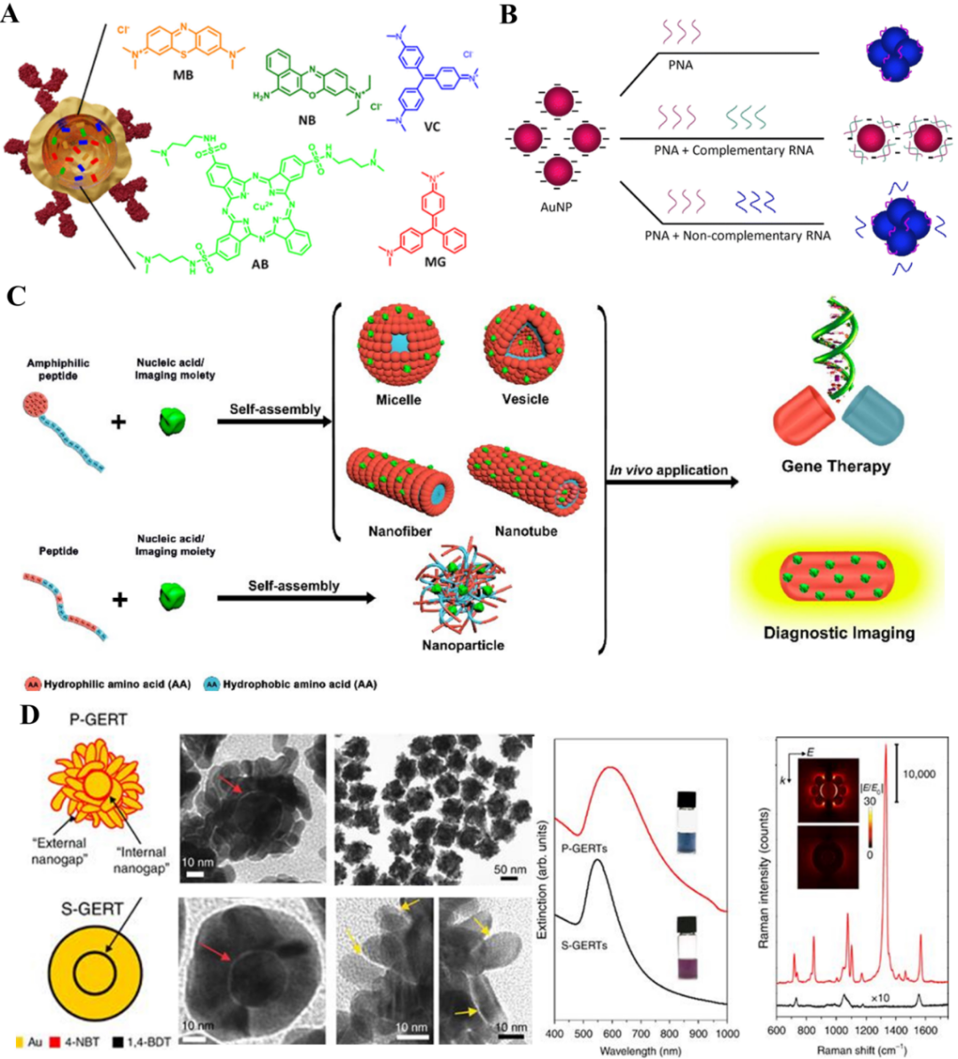 图2SERS探针结合基底和拉曼报告分子: (A) 拉曼报告分子;(B) 使用AuNP比色检测分析的RNA检测方法;(C) 肽和氨基酸如何使金纳米颗粒功能化;(D) 金纳米粒子的能隙增强尽管SERS基底性能显著提升,其大规模应用仍面临制备复杂、均一性控制困难及信号一致性差等挑战。贵金属纳米材料虽然灵敏,但易氧化或团聚,需要进行额外修饰才能在复杂环境下发挥作用。为此,研究人员提出多种解决方案:(1)通过在基底表面包覆二氧化硅或高分子层对其进行仿生化修饰提高稳定性和生物相容性;(2)将金属纳米结构负载至聚合物或纤维膜上制备柔性基底从而适应曲面或柔性器件的原位检测;(3)利用光热或pH敏感材料动态调控“热点”分布,实现按需增强。此外,3D多孔基底通过增加分子吸附位点,能显著提升检测通量。SERS探针通过将拉曼报告分子固定在贵金属纳米颗粒表面,能够实现对生物分子的高灵敏检测。常用的拉曼报告分子通常具备以下结构特征。首先,它们应具有较高的拉曼散射截面(如罗丹明、亚甲基蓝),能够显著增强信号强度;其次,含有特定官能团(如4-巯基苯甲酸、巯基吡啶、巯基嘧啶),使其能够牢固吸附在贵金属纳米颗粒表面;此外,具备共轭电子体系(如四甲基罗丹明、结晶紫),可提高极化率变化并增强拉曼信号;最后,这些分子具有良好的稳定性,不易降解(如偶氮染料、三苯基甲烷染料),从而保证信号的可靠性。在SERS探针的应用中,这些拉曼报告分子被固定在贵金属纳米颗粒表面,并结合保护壳上的靶向配体,实现对生物分子(如蛋白质、DNA等)的高灵敏度检测。为了确保SERS探针能够高效识别乳腺癌细胞,设计时需要针对特定的分子标志物进行功能化修饰。通过将抗体、肽链或其他靶向分子修饰到纳米颗粒表面,探针能够精确识别乳腺癌细胞表面特定抗原(如HER2、ER等),从而实现对肿瘤细胞的高效靶向识别。为了增强探针的信号强度,探针设计时需选择合适的粒径、形状(如纳米球、纳米棒、纳米星等)以及金属材料(如金、银),并优化金属纳米颗粒的LSPR效应,从而增强信号。此外,探针表面的保护层或功能化修饰可防止在体内环境中金属纳米颗粒发生氧化或聚集,从而维持其稳定性。在具体修饰方法方面,SERS探针的表面通常会通过聚乙二醇(Polyethylene glycol,PEG)、白蛋白等生物相容材料进行功能化,以降低金属纳米颗粒的毒性和免疫原性。聚合物材料或水溶性物质如PEG常被用于表面修饰,以提高探针的生物相容性,减少其对细胞或组织的负面影响。还可以通过静电吸附或化学共价键将靶向分子与金属纳米颗粒结合。通过这些修饰,探针不仅能提高其生物相容性,还能增强其在乳腺癌细胞识别中的特异性和稳定性。SERS探针的灵敏度在乳腺癌检测中的应用至关重要。为提高灵敏度,通常选择具有较强表面增强效应的纳米材料,并确保其表面有足够的功能基团以增强与目标分子之间的相互作用。通过优化金属纳米颗粒的尺寸、形态和分布,可以进一步提高拉曼信号的强度,进而提升探针的检测灵敏度。
