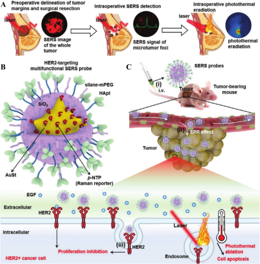 图1 (A)SERS中常规拉曼、局域表面等离子体共振(LSPR)和电磁增强机制的示意图;(B) 无标记SERS检测原理:吸附介导的无标记SERS检测和抗体/配体介导的无标记SERS检测;(C) 典型SERS探针的制备流程SERS能够实现单分子检测在很大程度上是由于吸附在纳米结构金属上,如金或银纳米颗粒表面的那些分子对非弹性光散射的增强(106~108)。与其他高灵敏度技术相比,SERS检测无需复杂的样品制备程序,减少了前处理步骤。总体而言,SERS正迅速成为在生物分析、疾病检测和诊断中成功应用的重要分析技术。此外,生物相容的SERS活性纳米颗粒或底物可以涂覆适当的表面活性剂或保护壳,以提高其在生物环境中的稳定性。这些纳米颗粒或底物可以用于直接检测或通过特定受体、适体等实现间接检测,从而实现对生物分析物的高效识别。无论是直接检测还是间接检测,SERS技术都表现出高精度和卓越的灵敏度,能够为乳腺癌转移的早期诊断和治疗评估提供可靠的检测手段。SERS技术包括直接检测和间接检测两种方法。直接检测是指通过分析目标分子的固有拉曼指纹信号来识别目标分子,无需任何外部信号标记(图1B) 。这种方法具有较强的吸引力,尤其在单分子层面的高灵敏度检测中表现突出,因为它能够直接获取目标分子的独特信息,避免了传统方法中可能引入的干扰或误差。然而,其实际应用受限于两个关键问题:一是大多数生物分子本身的拉曼散射截面较小,信号微弱。二是在生物体系中,纳米探针表面易被血清蛋白吸附形成“蛋白质冠”,该结构不仅屏蔽活性位点,还会显著削弱SERS信号强度,降低选择性,并影响体内循环稳定性。相比之下,间接SERS检测能在一定程度上克服直接检测的不足。该方法通常利用各种有机分子作为拉曼报告分子修饰在贵金属纳米颗粒表面,并在其外层包覆保护壳,同时连接特异性的靶向配体,从而实现对蛋白质、DNA及其他生物标志物的间接检测(图1C)。在间接SERS检测中,通过将靶向部分连接到纳米材料上,然后将SERS标签结合到分子靶标上并通过报告分子的拉曼信号来识别靶标。与自发拉曼散射相比,SERS信号在纳米尺度上的显著增强,使其能够检测到极低浓度甚至是单分子级别的生物分子。通过在SERS探针表面修饰靶向单元(如单克隆抗体、小分子配体或特异性肽链),可以实现对乳腺癌相关分子,如人类表皮生长因子受体2型(Human epidermal growth factor receptor 2,HER2)、表皮生长因子受体(Epidermal growth factor receptor,EGFR)以及黏蛋白1(mucin 1,MUC1)的特异性识别。靶向单元与肿瘤细胞表面受体高度亲和结合,有效提升信号的选择性,从而降低背景干扰。这种策略不仅增强了检测的可靠性,也有助于区分肿瘤细胞亚群,为肿瘤异质性分析提供数据支持。SERS技术可与其他临床影像手段和分子影像技术整合,实现多模态成像。SERS在分子层面提供高分辨率、指纹特征的信息,而其他成像技术则具备宏观结构显示或解剖定位功能。多模态融合不仅提升了成像的准确性与空间分辨率,还可用于乳腺癌病灶的多维度可视化,如检测肿瘤的确切位置、边界清晰度及潜在转移灶。SERS与荧光成像、MRI等联用,可同步实现微观检测与宏观观察,为精准诊断提供更可靠的依据。在乳腺癌转移的实时监测中,SERS具备较高的检测灵敏度和快速响应能力,能够在不需复杂样本前处理的前提下,实现对微量CTCs、Exos的直接检测。其窄峰宽、低背景干扰的光谱特性,使其能够精确区分结构相似的生物分子,克服传统荧光检测存在的光谱重叠问题。此外,与苏木精-伊红染色(Hematoxylin-eosin staining,HE染色)、免疫组织化学(Immunohistochemistry,IHC)聚合酶链式反应(Polymerase chain reaction,PCR)等常规方法相比,SERS可实现即时光谱获取,大幅提升检测效率,尤其适用于术中快速评估和病程动态监测。乳腺癌是一种具有高度分子异质性和易转移特征的恶性肿瘤,不同患者、甚至同一患者体内不同部位的肿瘤细胞,往往存在显著的分子表达差异。例如,HER2、雌激素受体(Estrogen receptor,ER)、孕激素受体(Progesterone receptor,PR)等标志物的表达水平可因细胞亚群的异质性或肿瘤微环境的变化而发生下调或缺失。这种情况容易导致单一标志物检测出现漏检,从而影响疾病的准确诊断与治疗决策。SERS探针通过设计多靶点识别平台,能够同时携带多个拉曼报告分子,靶向不同的分子标志物。这种多重检测策略可显著提升对乳腺癌相关生物信号的捕获能力,提高检测的灵敏度和特异性,有效降低假阴性率。例如,同时识别HER2、EGFR以及MUC1等,可涵盖更广泛的乳腺癌亚型,从而弥补单一标志物可能遗漏的病灶信息。从临床角度来看,识别多个分子标志物不仅有助于精准定位微小或隐匿的转移灶,还可用于评估肿瘤的侵袭性和耐药性,为制定个性化治疗方案提供重要依据,特别是在术前分型、术中导航及术后疗效追踪等环节,多靶标检测能够为临床提供更全面、动态的疾病信息,辅助医生实现更早期、更准确的干预。此外,多标志物策略也适用于监测治疗相关生物变化,例如肿瘤微环境中免疫细胞浸润、上皮-间质转化(Epithelial-mesenchymal transition,EMT)过程的标志物变化等,为抗药机制研究及新靶点筛选提供了强有力的技术支持。因此,基于SERS的多靶标检测平台不仅是应对乳腺癌分子复杂性的有效手段,也为推进精准医学提供了可行的解决方案。为进一步提高乳腺癌