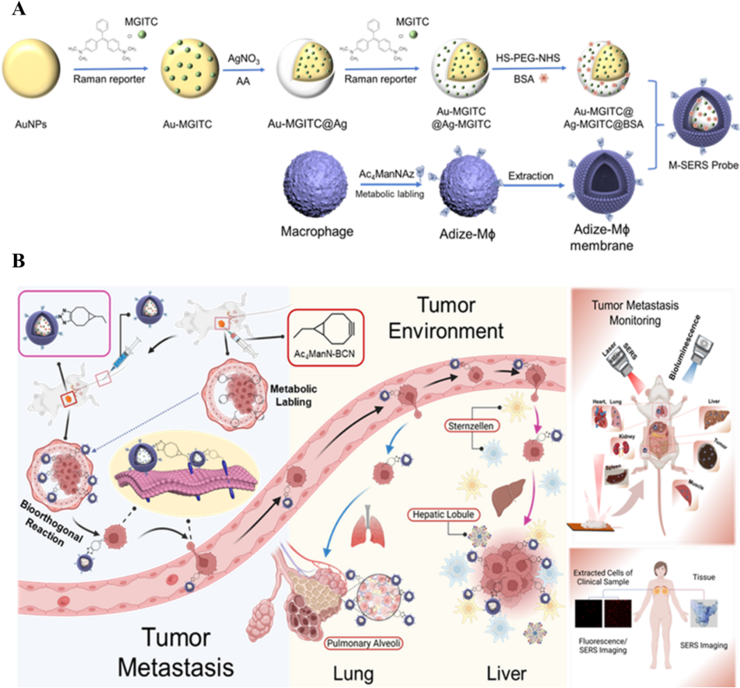 乳腺癌的转移是导致患者预后不良的核心因素。传统的检测方法存在灵敏度不足、侵入性强以及无法实时反映肿瘤微环境动态变化的问题,难以满足精准诊疗的需求。近年来,表面增强拉曼光谱(surface⁃enhanced Raman scattering,SERS)技术凭借其单分子级别的高灵敏度、优异的时空分辨率以及多重靶标检测能力,成为乳腺癌转移监测与治疗评估的重要工具。靶向肿瘤或肿瘤标志物的功能化SERS探针可以非侵入性地识别循环肿瘤细胞(circulating tumor cells, CTCs)、外泌体(exosomes,exos)及与转移相关的代谢物,实现乳腺癌转移的分子水平诊断。此外,SERS技术还可以检测药物在肿瘤部位的递送效率、释放动力学和治疗反应,为个体化治疗评估提供动态的分子图谱。本文综述了SERS技术在乳腺癌转移相关生物标志物检测、肿瘤微环境分析及疗效评估方面的最新进展,并探讨了探针靶向性优化、信号稳定性提高及临床转化的关键挑战。展望未来,随着多模态SERS探针的设计与人工智能数据分析技术的深度融合,SERS技术有望推动乳腺癌诊疗走向精准化和可视化的新阶段。