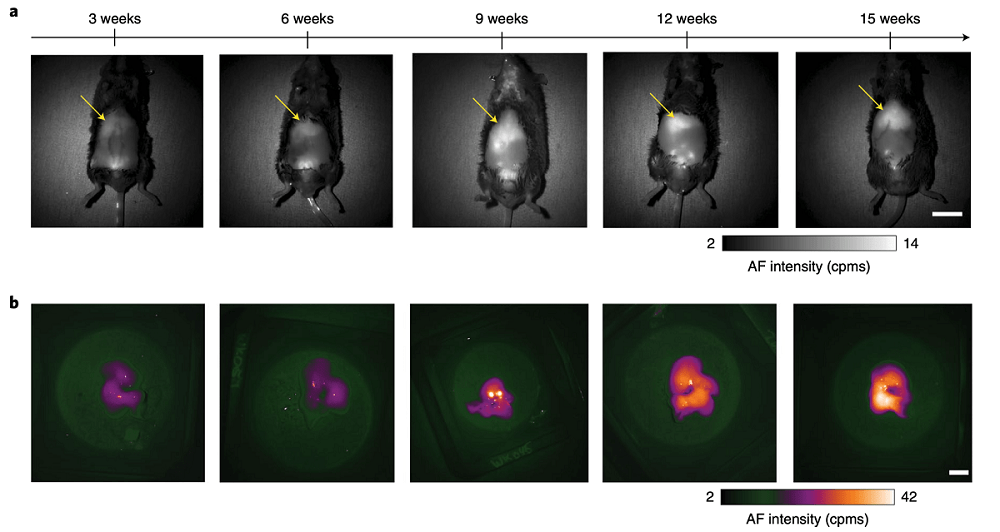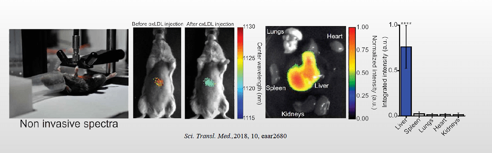 准非酒精性脂肪性肝病(NAFLD),由于缺乏用于监测炎症和肝纤维化进程的无创方法,肝活检仍是临床诊断NAFLD的金标。非酒精性脂肪性肝病的病理发展中氧化应激是关键驱动力之一,肝损伤和坏死性炎症由驱动纤维化的活性氧簇(ROS, Reactive oxidative species)介导,内源性脂褐素(lipofusion)是ROS的副产物,在808nm激光激发下,能够在近红外范围内被检测到,因此脂褐素的红外成像用于无创评估坏死性炎症活动和纤维化阶段,实现慢性肝病的无创监测。