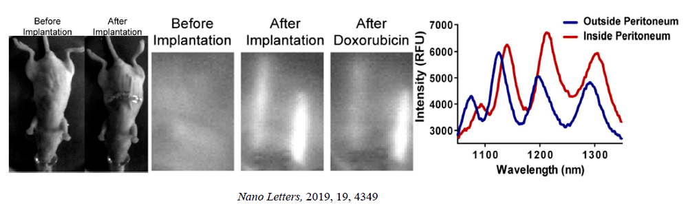特定器官和组织中的药物浓度通常用破坏性方法测量,费时费力。针对小剂量毒性药物,可使用功能化的红外探针,与药物接触时发光峰会发生削弱与红移,以实现对药物的检测。将纳米探针放入可长时间存留于生物体内的条形生物膜中,并植入皮下、腹腔内等不同腔室,药物在腹膜内释放后,可检测到内侧纳米探针发光强度减弱与红移。