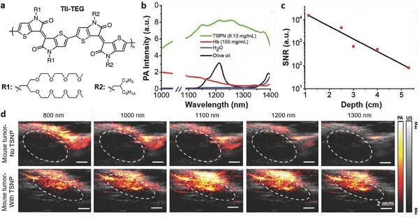 a)噻吩并靛蓝-三甘醇(TII-TEG)的化学结构;b)跨越不同波长的基于TII的半导体聚合物纳米颗粒(TSPN)、血红蛋白(Hb)、水(H2O)和脂质(由橄榄油表示)的PA强度;c)TSPN的信噪比(SNR)与从1064 nm处的激光激发照射的组织表面的深度的函数关系;d)在不存在(顶部)和存在(底部)不同波长的TSPN的情况下,小鼠肿瘤(点状白色圆圈)的体内PA成像。