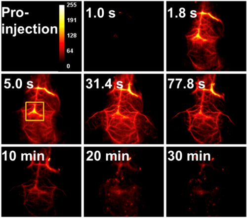 稀土纳米颗粒(RENPs)是一类稀土离子掺杂的荧光纳米材料,能够在近红外光激发下发射出位于第二近红外区的荧光。且其具有长荧光寿命、窄发射谱带、高光/化学稳定性、低毒性和可调谐荧光发射波长等优势,有望在生物分析和疾病诊断等领域发挥重要作用。利用染料敏化RENPs的复合材料,成功实现了非侵入性、高分辨率脑血管成像,清晰观察到脑血管网络结构及细小的毛细血管结构,并可实时监测生理过程中血液动力学及血管结构的变化。