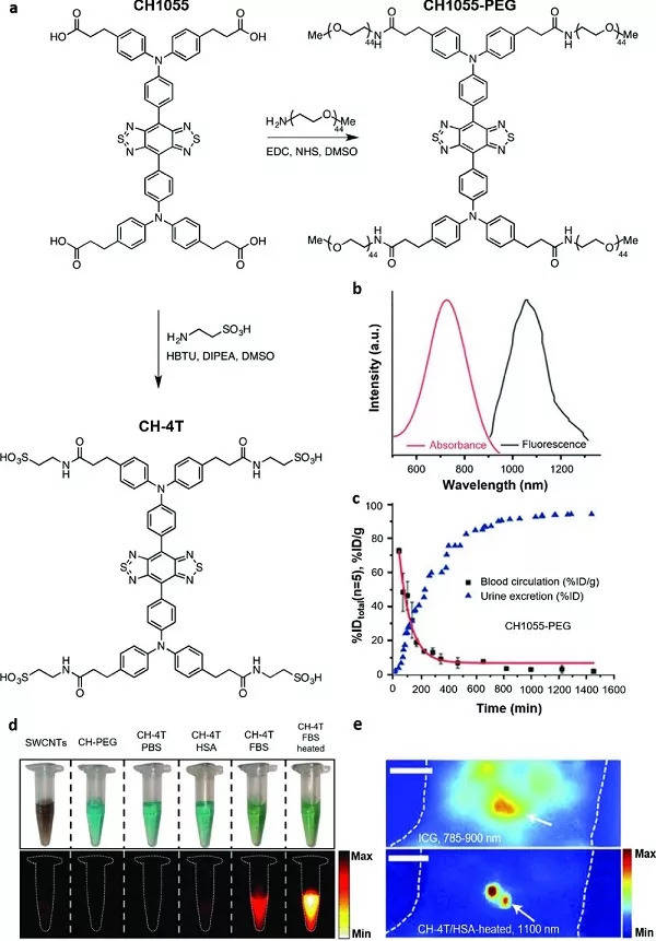 a)CH1055及其衍生物(即CH1055-PEG和CH-4T)的化学结构,以及基于DMSO中的EDC/NHS偶联和DMSO中HBTU/DIPEA偶联产生CH1055-PEG和CH-4T的合成途径;b)CH1055-PEG的吸收和发射光谱;c)CH1055-PEG随时间的体内血液循环和尿液排泄的特征,表明其快速从体内清除;d)各种NIR-II造影剂的光学照片,即单壁碳纳米管(SWCNT)、CH-PEG和不同处理的CH-4T以及它们各自的NIR-II荧光图像;e)在将ICG和CH-4T/HSA-HT顺序注射到其足垫中之后,小鼠的深淋巴结的NIR-1和NIR-II荧光图像(如白色箭头所示)。
