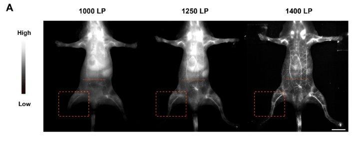 通过尾静脉注射PBS溶液中的NM-NPs雌性BALB/c小鼠。用1000LP、1250LP、1400LP滤光片进行160mW cm−2808 nm激光激发,当波长在1000~1400 nm之间变化时,血管的清晰度明显提高,1400LP滤光片NIR-II荧光成像的空间分辨率明显提高,清晰度显著提高。