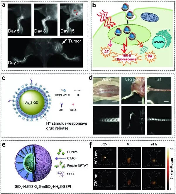 a)小鼠模型中肿瘤诱导的血管生成的实时图像。在4T1肿瘤移植后不同天数尾静脉注射PEG化Ag2S 量子点后30分钟后荧光图像。红色箭头指向肿瘤诱导的血管生成,如NIR-II PEG化Ag2S 量子点所示,而白色箭头指向4T1肿瘤; b)白蛋白纳米笼中应用Ag2S量子点用于多峰NIR-II荧光/ PA成像和光热疗法的示意图; c)Ald / DOX @ Ag2S纳米颗粒的结构和组成的示意图; d)Ald / DOX @ Ag2S纳米颗粒在各种骨组织(包括脊柱、腿骨和尾巴)中的NIR-II荧光图像;e)NIR-II荧光下转换纳米颗粒(DCNP)负载的中孔微载体,即SiO2 -Nd2SiO2 @ mSiO2-NH2 @ SSPI的示意图;f)载有蛋白质-NPTAT复合物的微载体在730 nm或808 nm激发下在不同时间对小鼠进行NIR-II荧光成像。