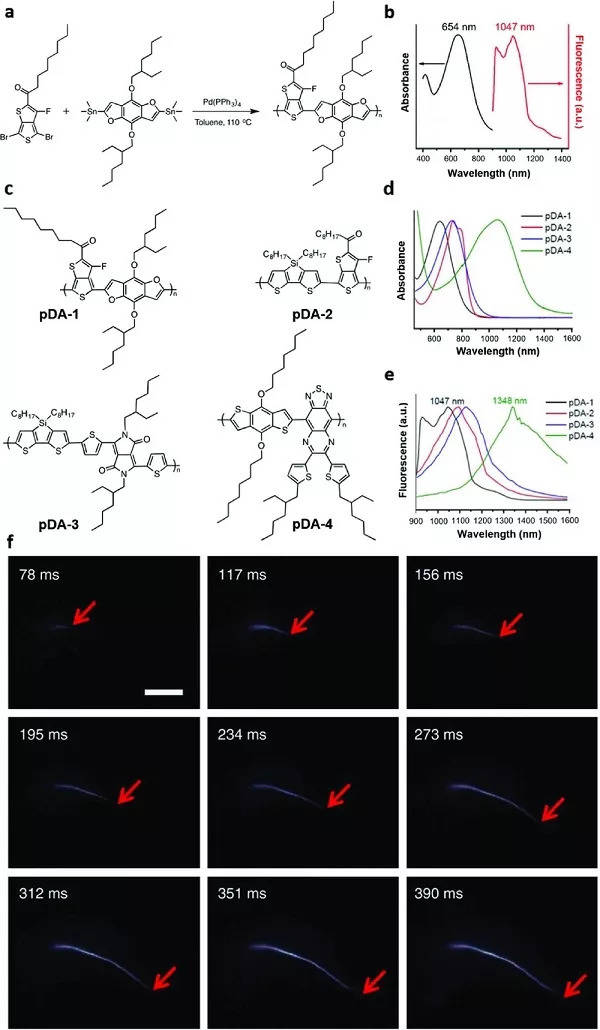 a)pDA聚合物的合成路线;b)pDA-PEG纳米颗粒的吸光度、荧光吸收和发射最大值分别为654和1047nm;c)各种pDA聚合物的化学结构;d、e)不同pDA聚合物的吸光度和荧光,表明pDA聚合物通过其化学结构的改性的光学性质的可调性;f)静脉内注射的pDA-PEG纳米颗粒随时间推移小鼠后肢股动脉血流的NIR-II荧光成像。 血流前方用红色箭头表示。