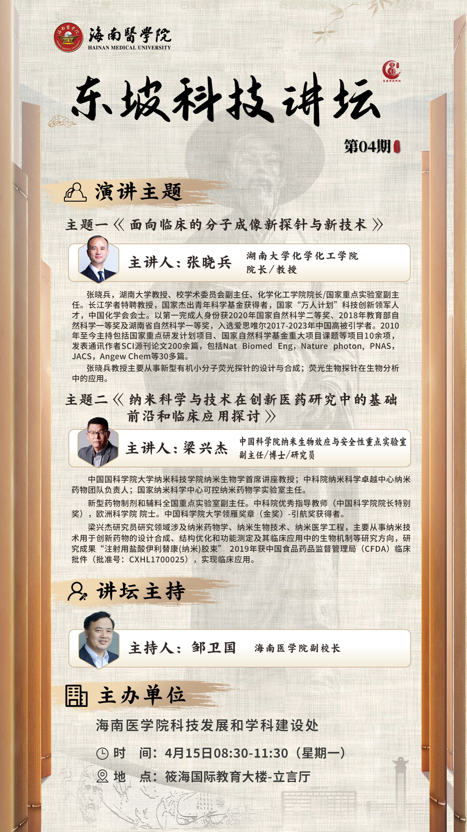 第04期 “东坡科技讲坛” 将于2024.04.15(周一上午) 8:30-11:30 在立言厅举行。主题一:《面向临床的分子成像新探针与新技术》,主讲专家:张晓兵 湖南大学化学化工学院院长/教授。主题二:《纳米科学与技术在创新医药研究中的基础前沿和临床应用探讨》,主讲专家:梁兴杰 中国科学院纳米生物效应与安全性重点实验室副主任/研究员。本次授予科研学分2.0分,请科研办主任积极组织相关人员参加讲座,并于4月14日 12:00前完成报名,谢谢合作!