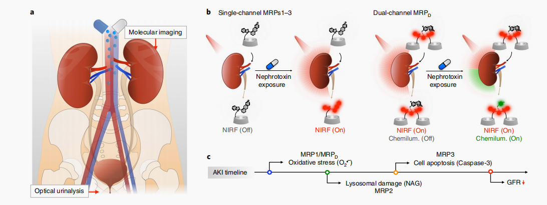 具有高发病率和死亡率的药物性急性肾损伤(AKI)在医院中诊断不佳,并且在药物发现中缺乏评估。在这里,我们报告了具有高肾清除效率的分子肾探针(MRP)的开发,用于药物诱导的AKI的体内光学成像。MRPs特异性地激活其近红外荧光或化学发光信号,朝向AKI的前驱生物标志物,包括超氧阴离子,N-乙酰基-Β-D-葡萄糖胺酶和半胱天冬酶-3,从而可以对活小鼠肾脏中的多个分子事件进行纵向成像。重要的是,它们原位报告了氧化应激,溶酶体损伤和细胞凋亡的顺序发生,这在AKI(肾小球滤过减少)的临床表现之前。这种主动成像机制允许MRPs比现有成像方法至少提前36小时无创地检测顺铂诱导的AKI的发作。MRP 还可以作为光学尿液分析的外源性示踪剂,优于典型的临床/临床前测定,证明了其在 AKI 早期诊断方面的临床前景。