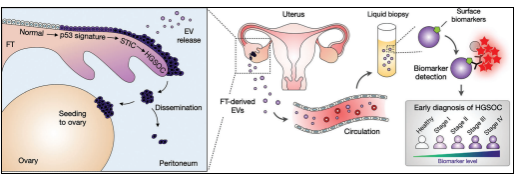 Detecting early cancer through liquid biopsy is challenging due to the lack of specifific biomarkers for early lesions and potentially low levels of these markers. The current study systematically develops an extracellular-vesicle (EV)-based test for early detection, specififically focusing on high-grade serous ovarian carcinoma (HGSOC). The marker selection is based on emerging insights into HGSOC pathogenesis, notably that it arises from precursor lesions within the fallopian tube. This work thus establishes murine fallopiantube (mFT) cells with oncogenic mutations and performs proteomic analyses on mFT-derived EVs. The identifified markers are then evaluated with an orthotopic HGSOC animal model. In serially-drawn blood of tumor-bearing mice, mFT-EV markers increase with tumor initiation, supporting their potential use in early cancer detection. A pilot clinical study (n = 51) further narrows EV markers to fifive candidates, EpCAM, CD24, VCAN, HE4, and TNC. The combined expression of these markers distinguishes HGSOC from non-cancer with 89% sensitivity and 93% specifificity. The same markers are also effffective in classifying three groups (non-cancer, early-stage HGSOC, and late-stage HGSOC). The developed approach, for the fifirst time inaugurated in fallopian tube-derived EVs, could be a minimally invasive tool to monitor women at high risk of ovarian cancer for timely intervention.