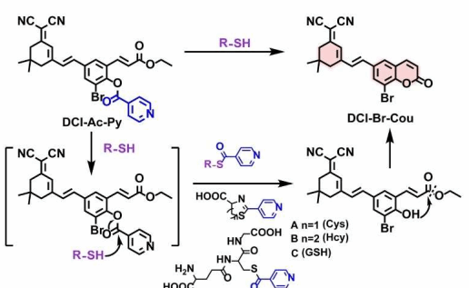 脑缺血-再灌注损伤(CIRI)与生物硫醇的氧化还原调节密切相关,生物硫醇是阻止ROS发生的重要抗氧化标志物。我们设计了一种新型的荧光探针DCI-Ac-Py,显示了各种物理化学性质,如高选择性、异常的信噪比、近红外(NIR)光学窗口和血脑屏障(BBB)穿透性,用于检测大脑中的生物硫醇。吡啶醇酸盐作为一种特定的识别基团,可被生物硫醇快速激活,并与邻近的丙烯酸酯进行亲核取代,以产生所需的NIR探针。此外,探针通过包含卤素原子提高脂溶度,这有助于穿透血脑屏障。利用DCI-Ac-Py,我们研究了CIRI期间小鼠大脑体内生物硫醇的变化。我们发现生物硫醇介导的NF-kB经典(p65相关)和非经典(relb相关)途径有助于CIRI诱导的大量ROS产生,生物硫醇参与氧化还原调节。这些发现为CIRI的研究提供了新的见解,并阐明了大脑中生物硫醇的生理和病理机制。