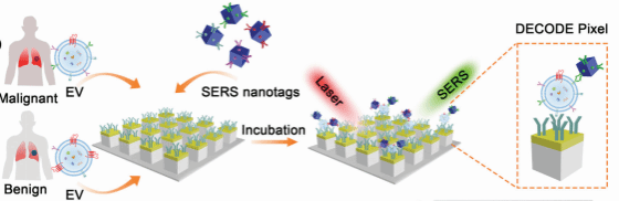 differentiating malignant and benign lung nodules via a liquid biopsy-based approach. Aiming to characterize phenotypes between malignant and benign groups, they develop a single-molecule-resolution-digital-sEV-counting-detection (DECODE) chip that interrogates three lung-cancer-associated sEV biomarkers and a generic sEV biomarker to create sEV molecular profiles. DECODE capturess EVs on a nanostructured pillar chip, confines individual sEVs, and profiles sEV biomarker expression through surface-enhanced Raman scattering barcodes.The author utilize DECODE to generate a digitally acquired sEV molecular profiles in a cohort of 33 people, including patients with malignant and benign lung nodules, and healthy individuals.Significantly, DECODE reveals sEV-specific molecular profiles that allow the separation of malignant from benign (area under the curve, AUC = 0.85), which is promising for non-invasive characterisation of lung nodules found in lung cancer screening and warrants further clinincal validaiton with larger cohorts.