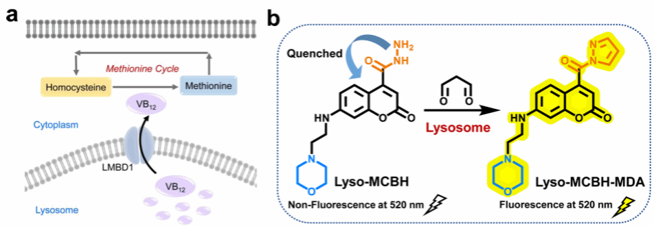 脑缺血再注灌损伤(CIRI)通常伴有同型半胱氨酸(Hcy)水平的上调,从而导致一系列的神经病变。维生素B12疗法是降低Hcy水平以治疗CIRI的理想治疗手段。然而,最近临床试验发现该疗法无效,这可能是由于维生素B12在CIRI过程中的运输受到了干扰。CIRI的生理病理学与溶酶体中的氧化应激密切相关,因此,可能是CIRI期间的氧化应激阻碍了维生素B12的运输。溶酶体丙二醛(MDA)是溶酶体氧化应激的生物标志物,并且极易导致溶酶体中酶或蛋白质的损伤。因此,可能是溶酶体MDA上调损伤了钴胺递运蛋白(LMBD1)的功能而阻碍维生素B12的运输。但是目前缺乏能够实时、原位监测大脑溶酶体MDA的精密工具来进行验证。