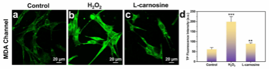 4. 为了确认荧光信号的变化是由MDA水平的变化引起的,在加入H2 O2之前,用L-肌肽(MDA清除剂)预处理PC 12细胞30分钟。成像结果描述了清除组的荧光明显弱于刺激组的荧光(图2a-d),证明荧光信号的变化确实代表了MDA水平的通量。基于上述成像结果,可以得出结论,Lyso-MCBH对MDA具有高选择性,并且可以实时和原位地观察活细胞中MDA水平的波动。
