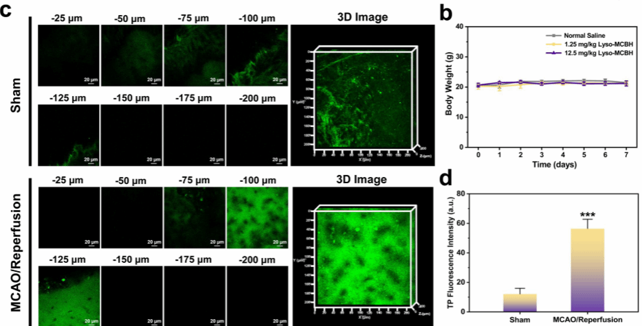 7.在体内成像实验之前,进行Lyso-MCBH的体内毒性实验和注射时间优化实验(图4 b和S13)。MCAO/再灌注组和假手术组腹腔注射LysoMCBH(500 μM,150 μL)1.25 mg/kg,持续30 min,并用2.5%三溴乙醇(320 μL)400 mg/kg麻醉。随后,通过双光子激光共聚焦显微镜追踪小鼠脑中的溶酶体MDA水平(图4a)。成像结果显示,与假手术组相比,MCAO/再灌注组的脑中的荧光显著增强(图4c,d),这与细胞成像一致。上述结果表明,MCAO/再灌注组小鼠脑内溶酶体MDA含量明显高于假手术组。Lyso-MCBH的成像深度可达200 μm,具有足够的组织穿透性,可用于脑成像。值得注意的是,这是第一次研究实时和原位捕获在MCAO/再灌注小鼠脑中升高的溶酶体MDA水平。