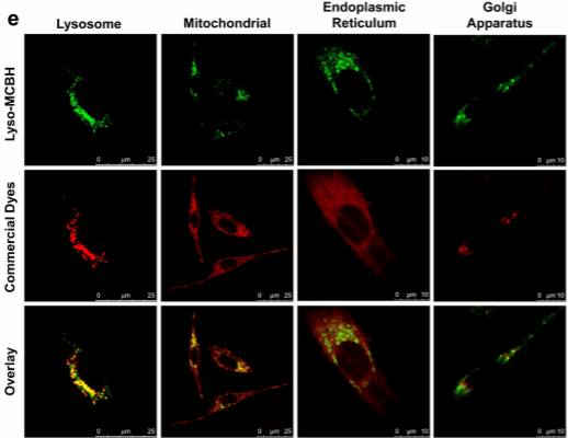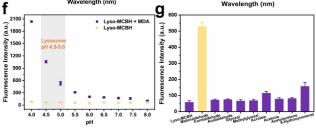 3.为了研究LysoMCBH对MDA的荧光响应是否具有特异性,我们测量了LysoMCBH对各种生物相关物质的响应,包括活性羰基物质(RCS)、活性氧物质(ROS)、金属离子、氨基酸、还原物质等。如图1g所示,当Lyso-MCBH与其他生物活性物质孵育时,520 nm处的荧光很微弱。只有当Lyso-MCBH与MDA孵育时,520 nm处的荧光才显著增强。这些结果证明Lyso-MCBH对MDA具有特异性荧光响应,其他竞争生物物种对其几乎没有干扰。考虑到溶酶体是酸性细胞器(pH 4.5 - 5.0),我们测量了不同pH值对Lyso-MCBH对MDA的检测是否有干扰。结果表明,在pH 4.0−8.0范围内,Lyso-MCBH本身的荧光几乎没有波动,而Lyso-MCBH与MDA的反应在酸性环境下具有更好的荧光响应,这可能是由于酸性环境更有利于MDA和肼的环化和脱水(图1f)。