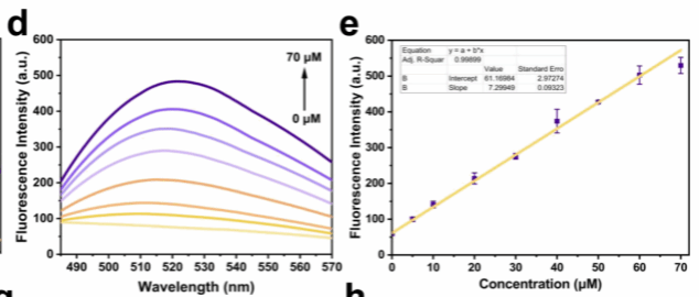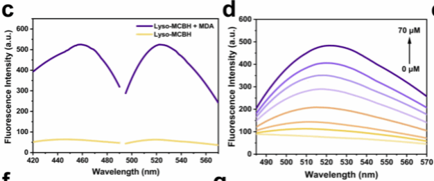 2. 测定Lyso-MCBH与不同浓度MDA反应的荧光强度。随着MDA浓度从0逐渐增加到70 μM,Lyso-MCBH在520 nm处的荧光强度呈现线性增强(图1d)。荧光强度与MDA浓度的线性方程为:F = 7.30 [MDA](μM)+ 61.17,线性相关系数为0.999,检测限为0.87 μM(图1 e)。上述数据表明,Lyso-MCBH对于病理生理学MDA检测具有适当的检测范围和灵敏度,32 - 34适用于在溶酶体pH环境下准确检测MDA。