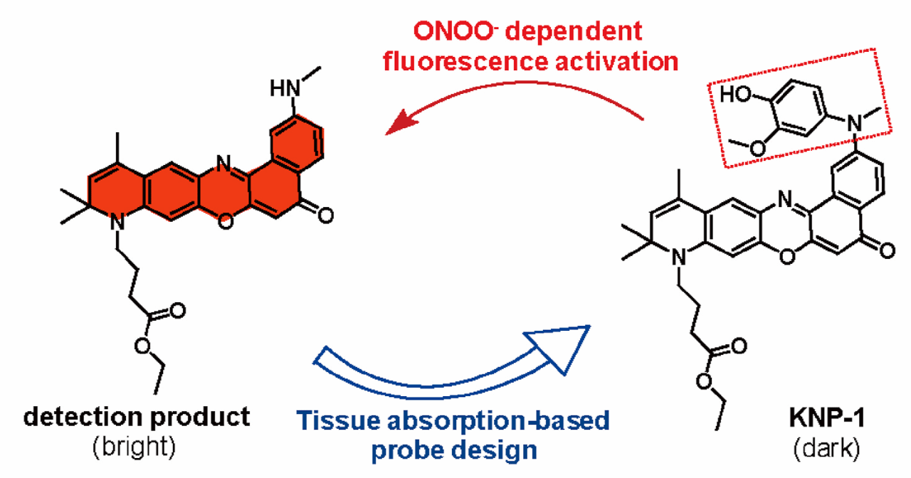 1. 作者团队以尼罗红衍生物为荧光基团,氢化喹啉基团为识别基团,开发了一种肾脏靶向探针KNP-1,可以特异性识别ONOO−。