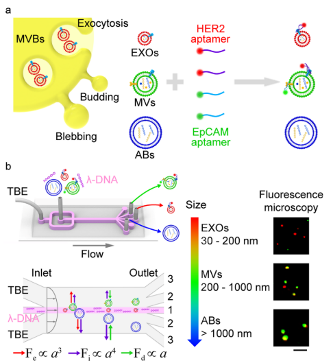 DNA分子提供了在原始样品中分类和检测ev的潜在手段。双链λDNA分子的溶液具有很强的弹性效应,允许微通道内的流体动力学聚焦或颗粒分选适配体是一种短单链寡核苷酸,对特定靶标具有高亲和力和选择性,在检测EV表面蛋白方面具有很大的前景。在这里,我们报道了一种λ-DNA和适体介导的方法,用于分离和检测单个EV水平的EV亚群。DNA适体(HER2和EpCAM特异性)首先被标记到EV表面,然后通过λ DNA介导的粘弹性微流体对EV亚群进行大小选择性分离。允许通过大小和标记表达对单个EV进行二维分析。应用机器学习算法分析EV亚群特征,以区分不同的乳腺细胞系和具有不同HER2表达的乳腺癌患者。
