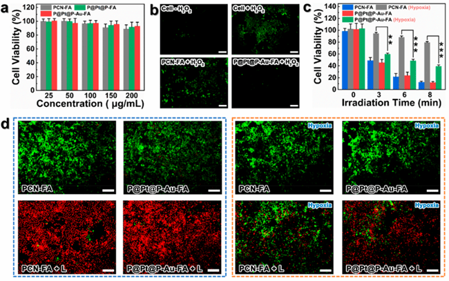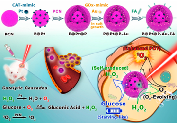要点:1.设计了一种新型的纳米反应器P@Pt@P-Au-FA。该纳米反应器利用金属有机框架(MOFs)作为载体,将模拟酶催化剂铂纳米颗粒(Pt NPs)和超小型葡萄糖氧化酶模拟剂金纳米颗粒(Au NPs)嵌入其中,并通过叶酸(FA)的配位实现靶向肿瘤治疗。这种设计使得纳米反应器具备了增强光动力疗法(PDT)和葡萄糖耗竭诱导的饥饿疗法的协同效应,从而提高了抗肿瘤治疗效果。