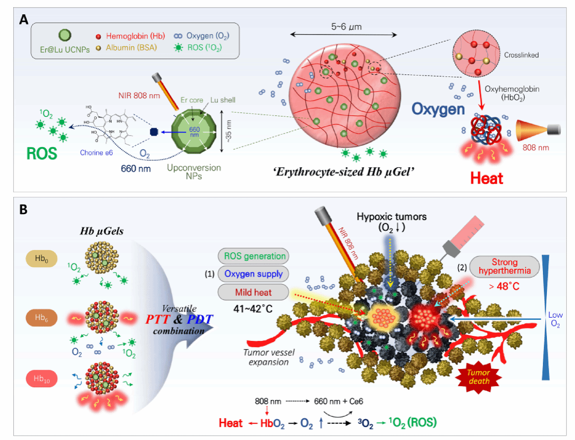 类红细胞血红蛋白(Hb)微凝胶(μGel)系统(5-6 μm)(Hb μGels),可以(i)产生热量,(ii)供氧,(iii) 响应近红外(NIR)激光照射产生活性氧(ROS;1O2)。Hb μGels包括Hb、牛血清白蛋白(BSA)、二氢卟吩e6 (Ce6)和铒@镥上转化纳米颗粒(UCNPs;~35nm)构成,可以有效地将808nm的近红外光转换为660 nm的可见光。
