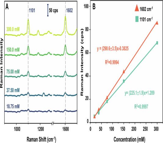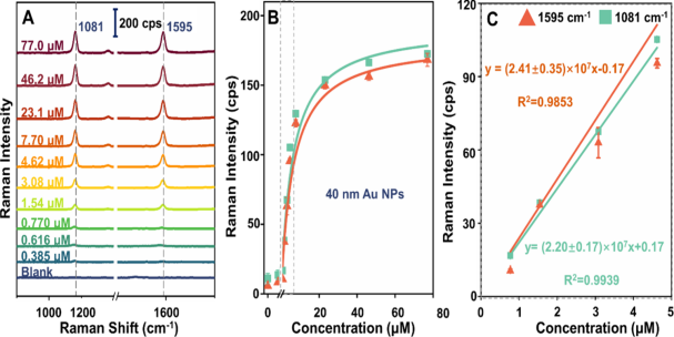 A:显示了4-MBA浓度依赖性SERS光谱,其中40nm胶体AuNP作为SERS衬底。由于4-MBA通过Au-S键的形成在AuNPs表面的强烈吸附,两个特征拉曼峰(即v12和v8)从1101厘米和1602厘米偏移至1081和1595厘米。
