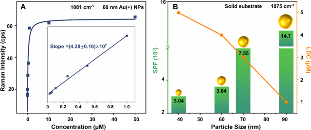 这四种固体SERS底物上与粒径相关的SPF和LDC。SPF随着AuNP尺寸的增加而稳定增加,这也与已充分讨论的尺寸依赖性EM增强一致。此外,SPF和LDC的相反AuNPs尺寸依赖性趋势也证实了SPF在评估固体SERS基材的SERS性能方面的优势。