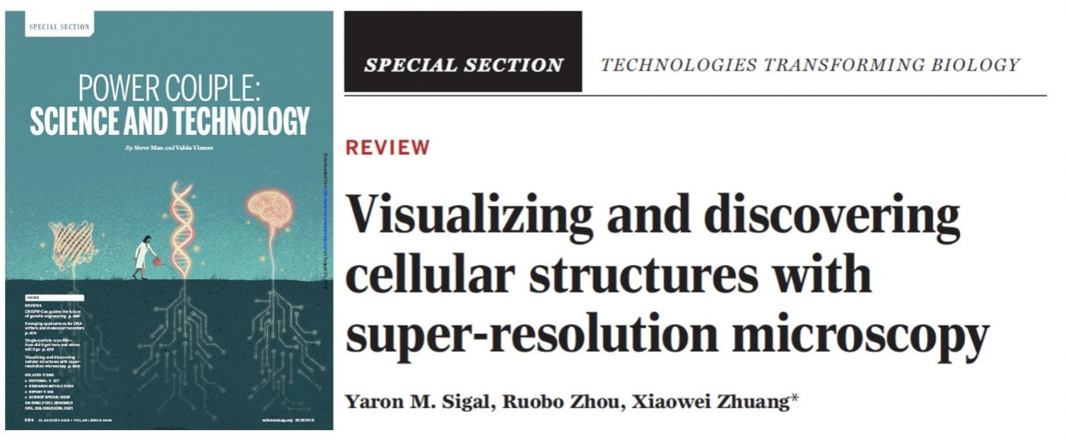 2018年8月31日,作为STORM超分辨显微技术的发明创始人,哈佛大学庄小威(Xiaowei ZHUANG)教授在Science杂志的特刊Science Special Section“技术改变生物”(图1左)上以通讯作者身份发表了题为Visualizing and discovering cellular structures with super-resolution microscopy的综述文章【1】(图1右),总结了以上提到的超分辨显微成像技术,并详尽地梳理了自问世以来,超分辨显微技术在观察和发现新的细胞结构、功能方面的卓越贡献。