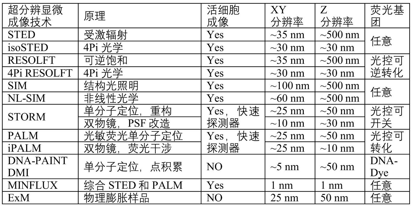 下表简单总结了几种主流超分辨技术的原理、三维成像能力、分辨率和荧光基团要求(总结并不完全,欢迎指正、补充)。