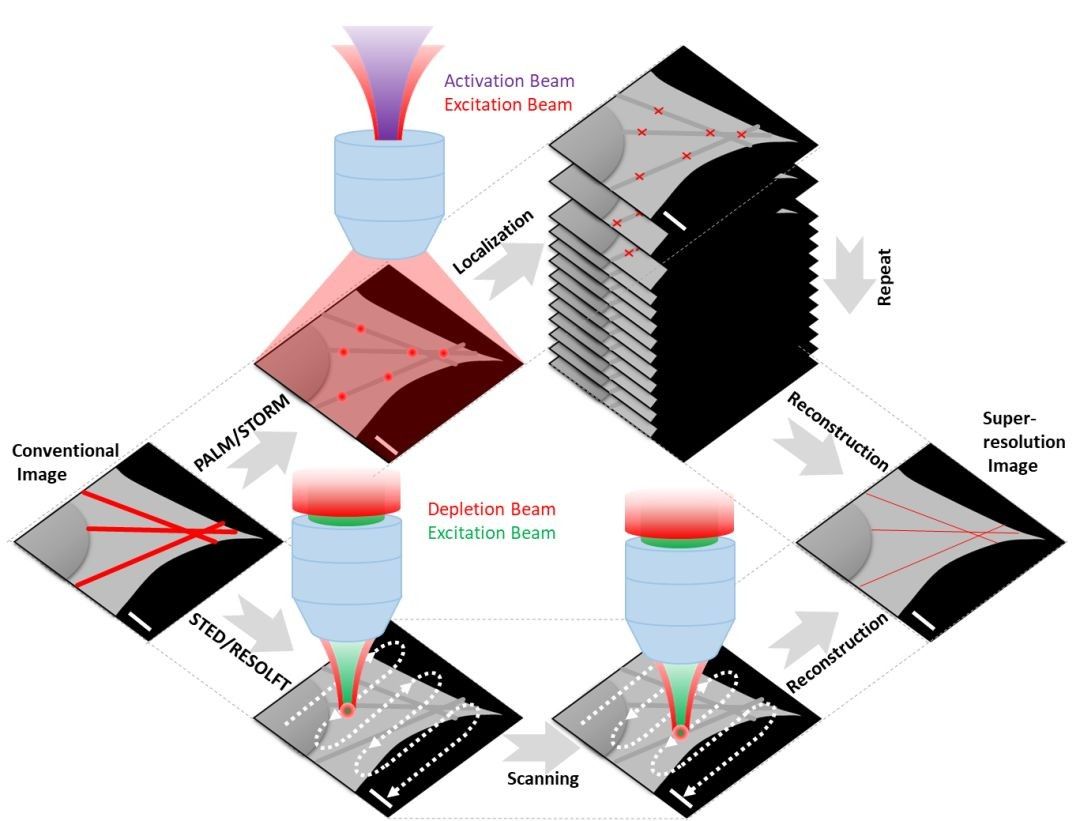 通常来说,现有的超高分辨显微技术被分为两大类,以STED和SIM为代表的“基于点扩散函数修饰”和“结构光照明”,还有以STORM/PALM为代表的“基于单分子荧光定位”的超分辨技术(图2)。
