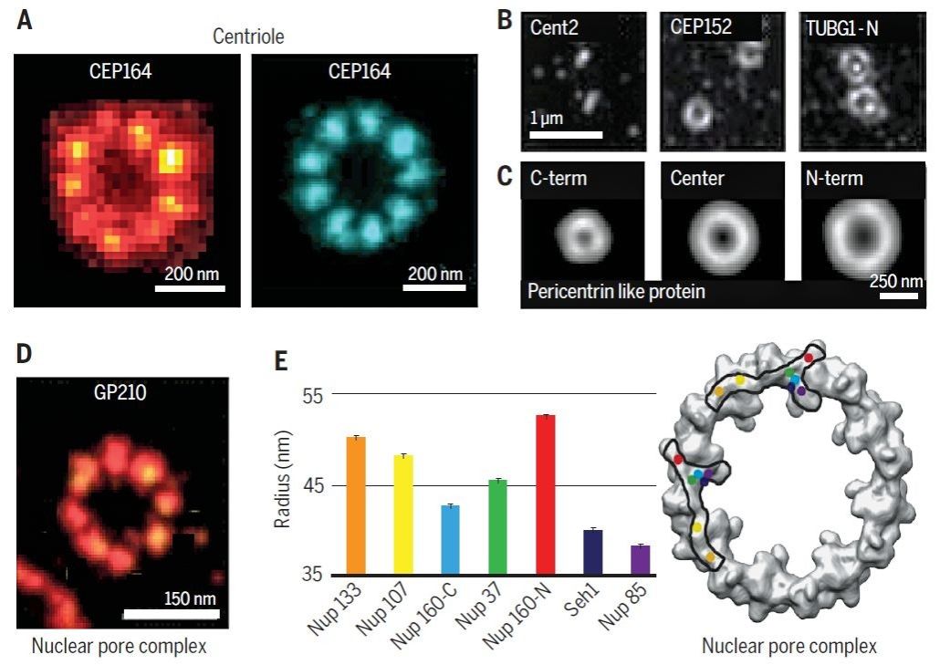 图6 超分辨显微技术用于解析中心粒(九重对称结构)和和孔复合物(八重对称结构)【1】