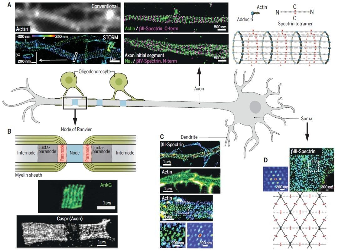 图4 超分辨显微技术用于解析神经细胞(轴突,郎飞结区,树突和胞体)中的膜相关周期性骨架(Membrane-associated Periodic Skeleton,MPS)【1】