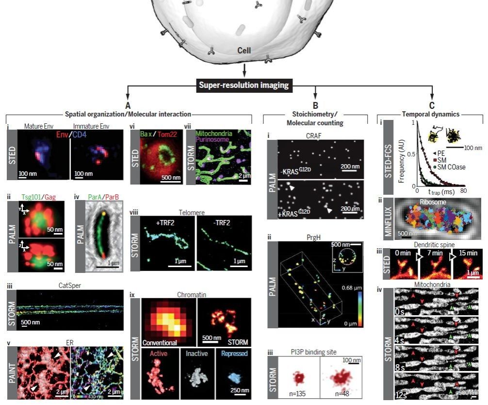 (i) STED解析病毒包膜蛋白Env和HIV-1受体CD4的空间关系。(ii)PALM解析ESCRT-I亚基Tsg101和HIV Gag蛋白共定位。 (iii) 3D STORM 解析精子特有钙离子通道CatSper1的四通道三维结构。 (iv) PALM解析细菌中ParA和ParB蛋白的极性分布。 (v) 左:栅格层状光显微术展示PAINT标记的ER,右:三维PAINT图像。 (vi) STED解析细胞死亡mediator Bax蛋白的环状结构和线粒体Tom20的关系。 (vii) STORM解析线粒体和嘌呤体核心蛋白FGAMS的相互作用。 (viii) STORM对比解析小鼠胚胎细胞中的端粒DNA在TRF2有或无的情况下的图像。 (ix) STORM对比解析“激活的”“非激活的”和“抑制的”染色质域。