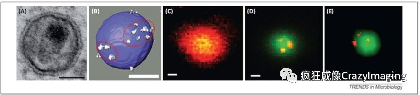 图12反应了不同显微观察方法下单独的HIV-1病毒颗粒。(A)电镜图可清晰看到静态的病毒形态,包括衣壳(蛋白)包裹着电子致密区(核相关蛋白位置),但病毒表面的Env蛋白无法特异显示出来。 (B)HIV-1 病毒颗粒的假想图。(C)共聚焦模式下的HIV-1病毒颗粒表面的Env蛋白(红色,比较模糊)。(D)与(E)显示同样的病毒颗粒在超分辨模式(大约40nm分辨率水平)下观察,可清晰地展示Env蛋白(红色)在病毒颗粒表面的分布,绿色背景是病毒核相关蛋白Vpr(标尺: A-B为50nm, C-E为100nm)。